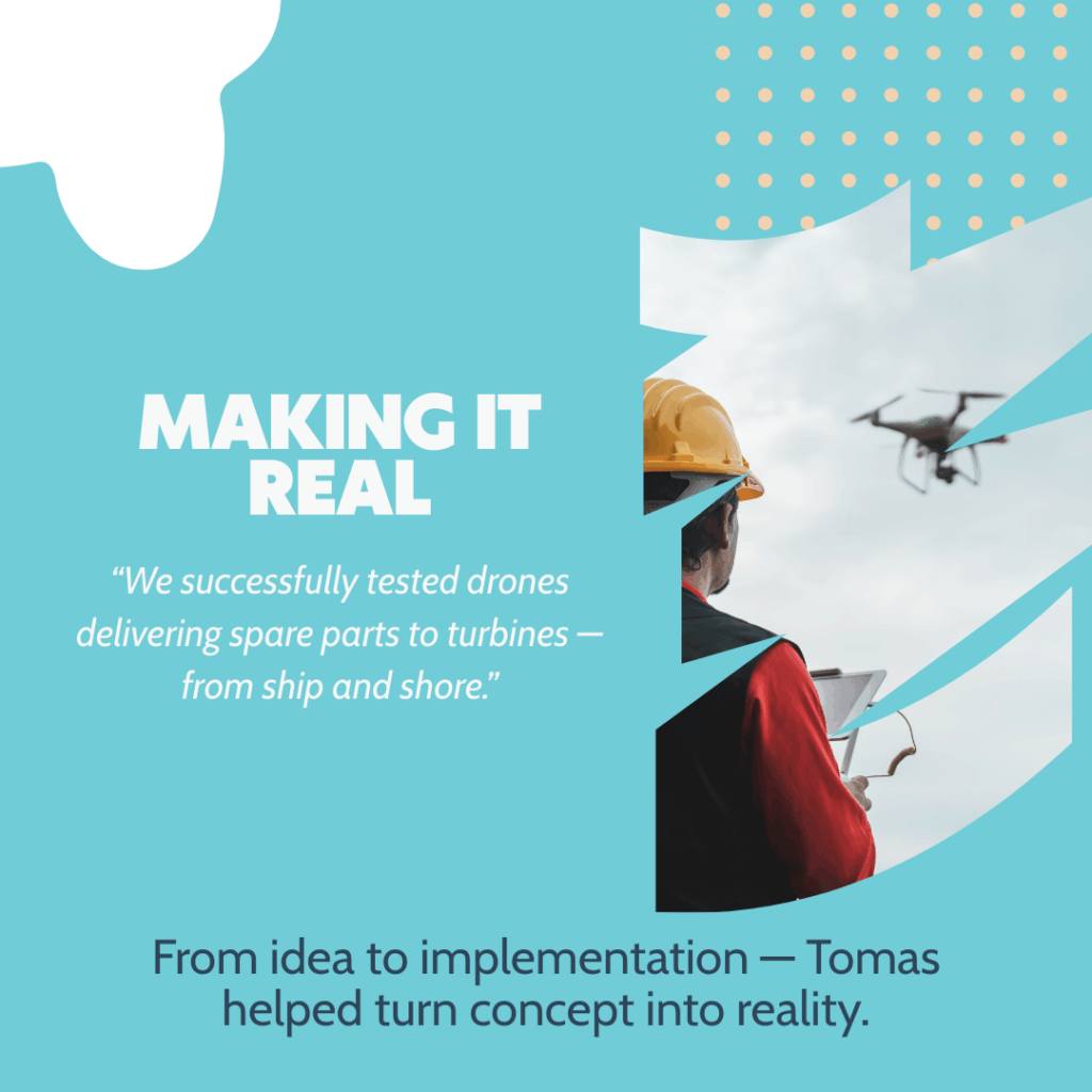 “We successfully tested drones delivering spare parts to turbines—first from a hotel vessel, later directly from shore. It went from concept to real-life application, and seeing the excitement from offshore teams was amazing.”