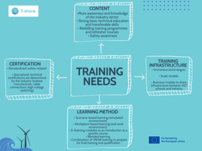 The T-shore project, aims to tackle these challenges head-on. It brings together 13 VET schools and representative industry partners from Belgium, the Netherlands, Norway, Denmark, and Ireland. The project started in June 2022 and will run until June 2026. The target group of T-shore is broad and goes beyond operations & maintenance operators. Specifically, the training programmes will target starting technicians, operators and coordinators whose training classified them as EQF 3-5 (European Qualification Framework), who are active in the entire supply chain of the ORE industry.